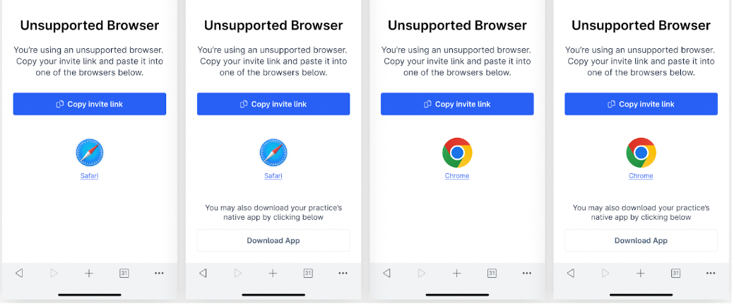 Depending on their device, if a patient tries to access KidzDocNow through an unsupported browser on their mobile device, they see one of these messages. They can either download the app or click the Copy invite link button and paste it into the address bar.