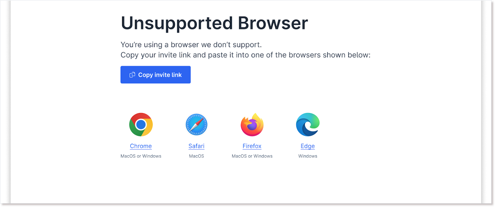 When a user attempts to use KidzDocNow with an unsupported browser, the user's progress is actively blocked and a message informing them that KidzDocNow does not support their browser displays (see below). Even if there’s a chance their browser may work, users cannot proceed. Links to current versions of supported browsers as well as a Copy invite link button so a user can paste it into the address bar are provided.